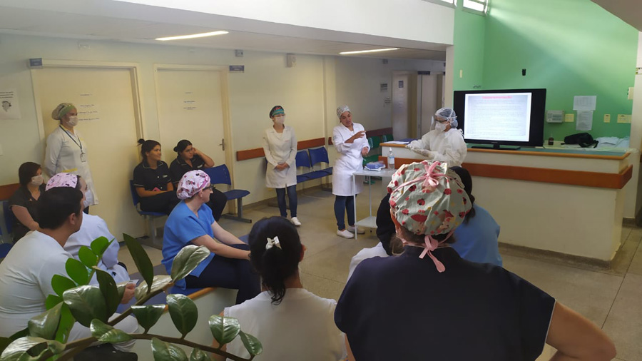 Esta foi a primeira de uma série de capacitações relacionadas à pandemia que serão realizadas com os profissionais da UPA, abordando assuntos como a desinfecção correta dos materiais de uso diário e do ambiente hospitalar e a importância da padronização da comunicação da equipe no combate ao Covid-19.