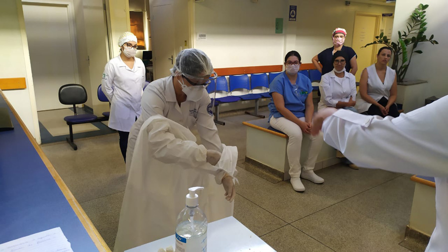 Alinhados à nova programação do estágio, reorganizada a fim de atender a demanda do município de Araras em relação ao Coronavírus (Covid-19), os estudantes ofereceram uma capacitação sobre as medidas de prevenção que devem ser adotadas pelos profissionais de saúde, incluindo o uso correto dos Equipamentos de Proteção Individual (EPIs).