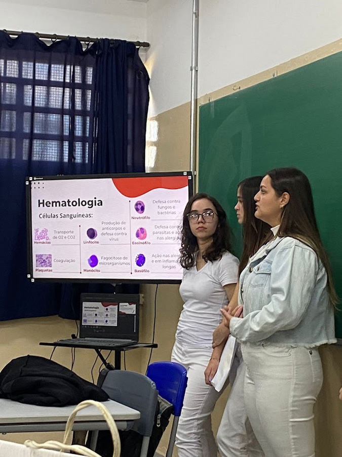 Inicialmente, os estudantes receberam orientações sobre a área de hematologia, explicando de forma didática as células sanguíneas em conjunto com a microscopia celular, e sobre a importância da realização de exames laboratoriais.