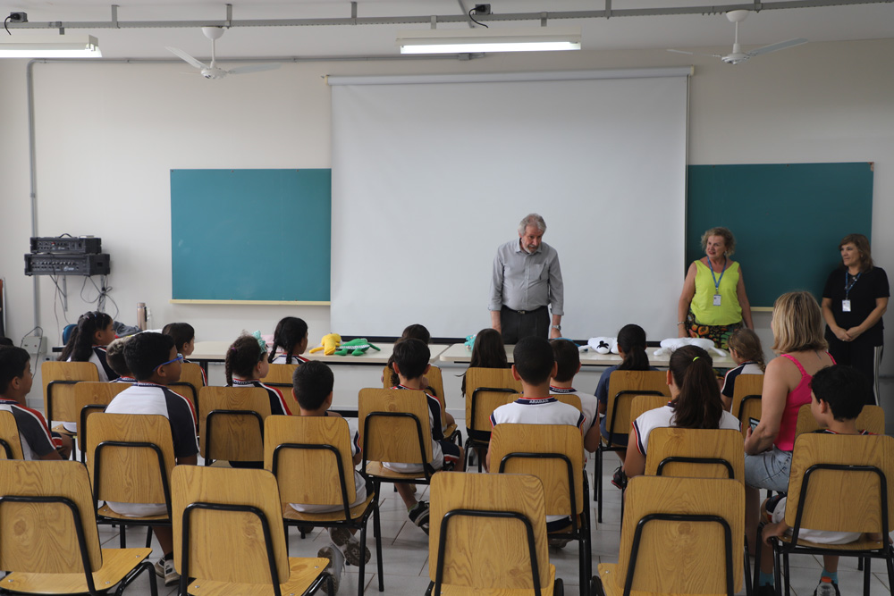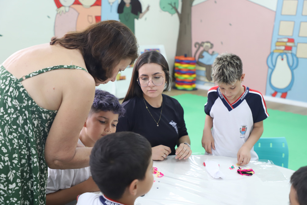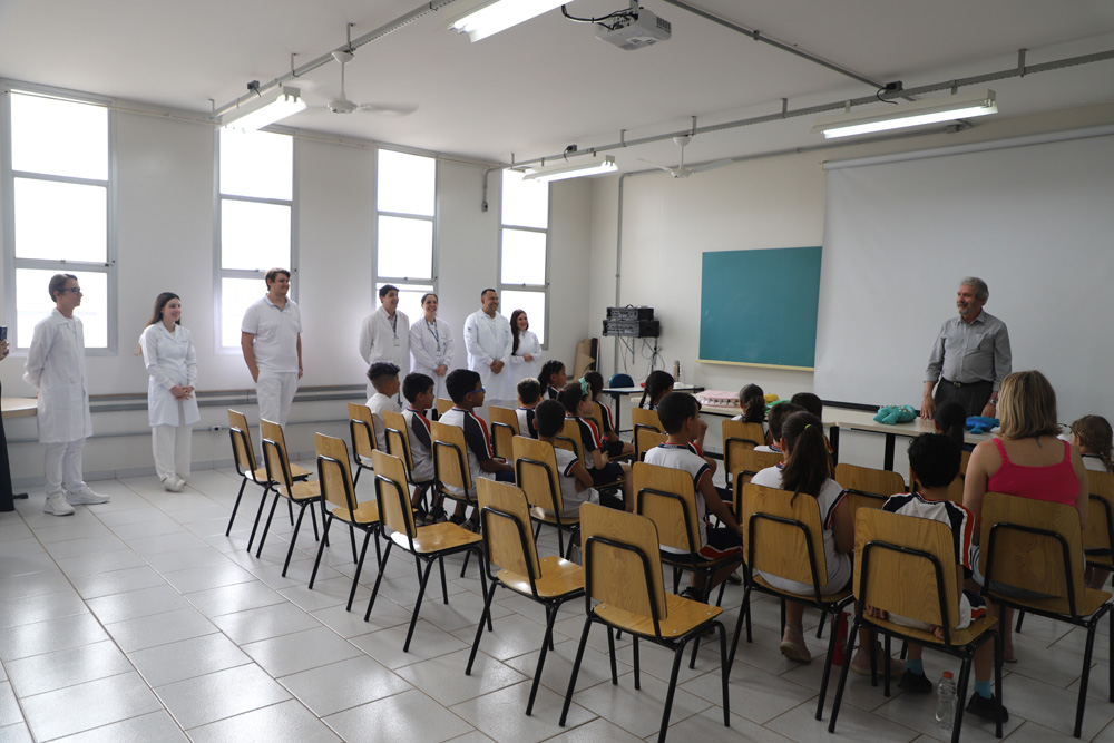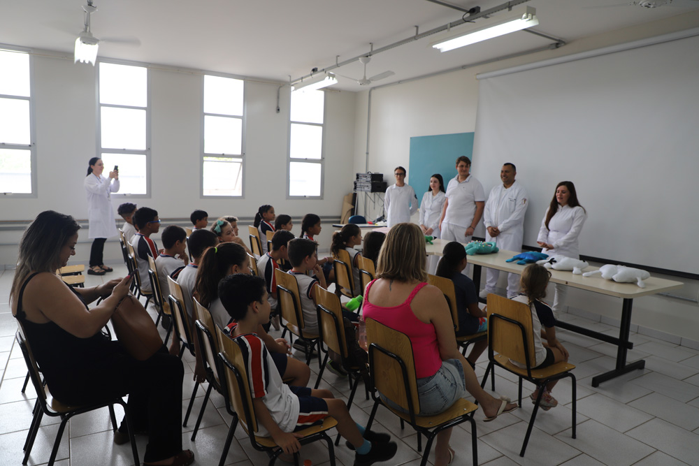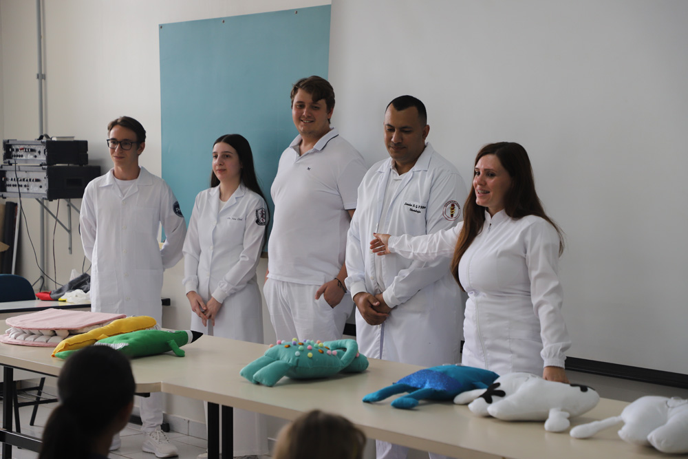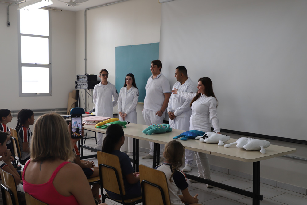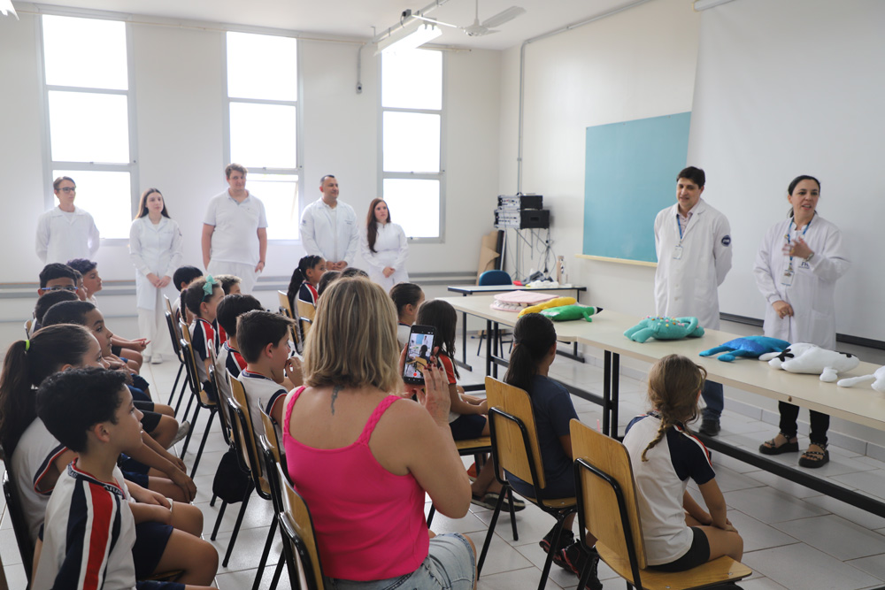 As crianças foram acolhidas pela coordenadora do curso, a Prof.ª Dra. Aneridis Monteiro, e pelas professoras Dra. Paula Nascimento da Silva Moura, Ma. Maria Luiza Vechetin Begnami e Ma. Renata Luigia C. Garcia, juntamente com as alunas Nathalia de Oliveira Alves, Estela Fernanda de Oliveira, Elizama Gomes Sampaio e Sara Alves Gomes.