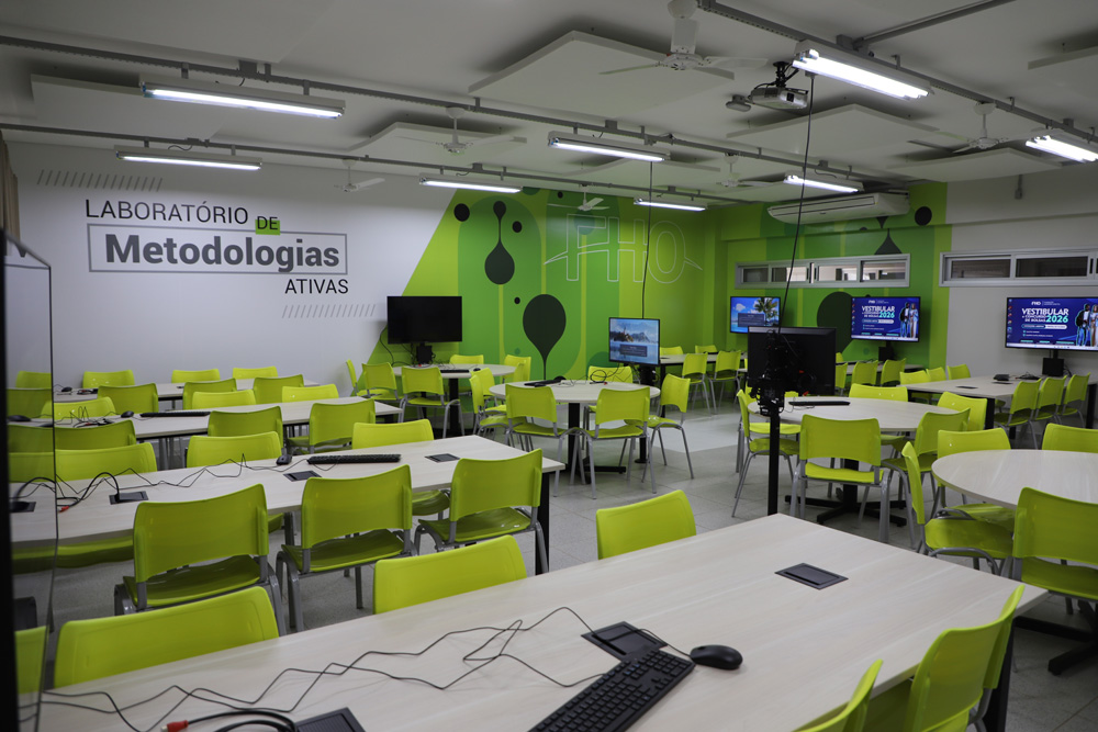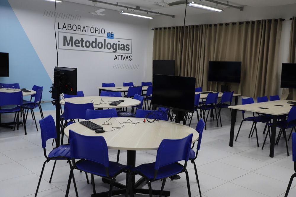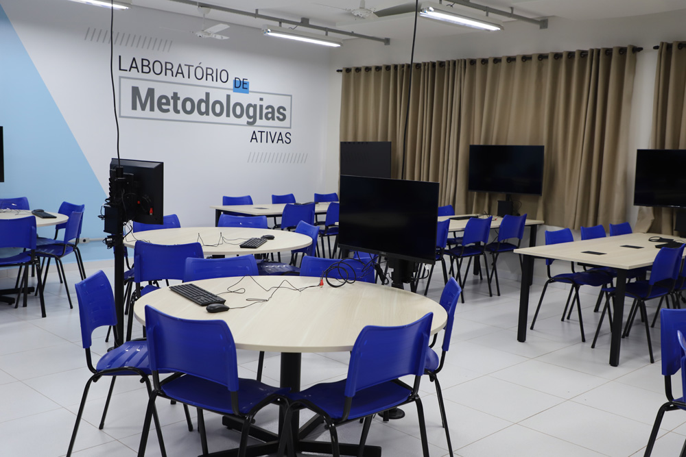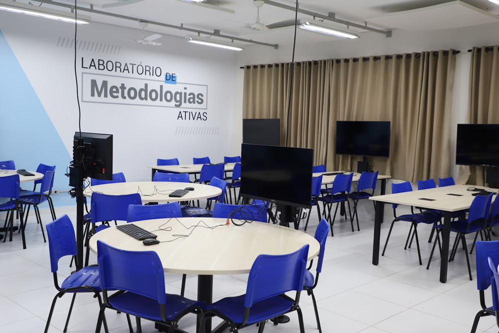 Diferente do formato tradicional de sala de aula, os Laboratórios de Metodologias Ativas são projetados para que o conhecimento seja construído de forma coletiva. Cada unidade conta com 12 mesas com capacidade para seis alunos cada, equipadas com computadores de monitor amplo e tomadas para notebooks, permitindo que os estudantes integrem seus próprios dispositivos às atividades de forma fluida.