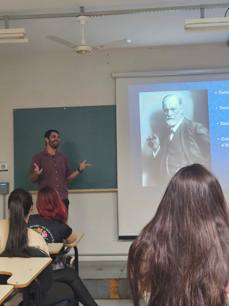 O convidado para mediar essa conversa foi Renato Luis Bertin, biólogo, psicanalista, hipnólogo e também aluno de Psicologia da FHO. Bertin trouxe uma perspectiva integrada sobre como a Psicanálise se encaixa nos debates epistemológicos atuais. Para ele, discutir o legado de Freud em uma aula de Biologia ajuda a compreender que teorias científicas emergem de contextos culturais específicos. ''A Psicanálise mostra que nem todas as explicações seguem modelos estritamente experimentais. Discutir sua relação com a ciência auxilia a cultivar sensibilidade para os aspectos subjetivos que permeiam toda produção científica'', destacou o profissional.