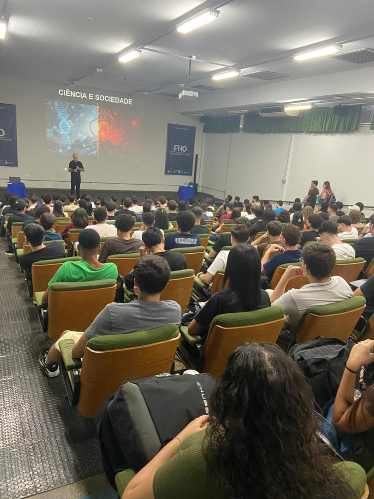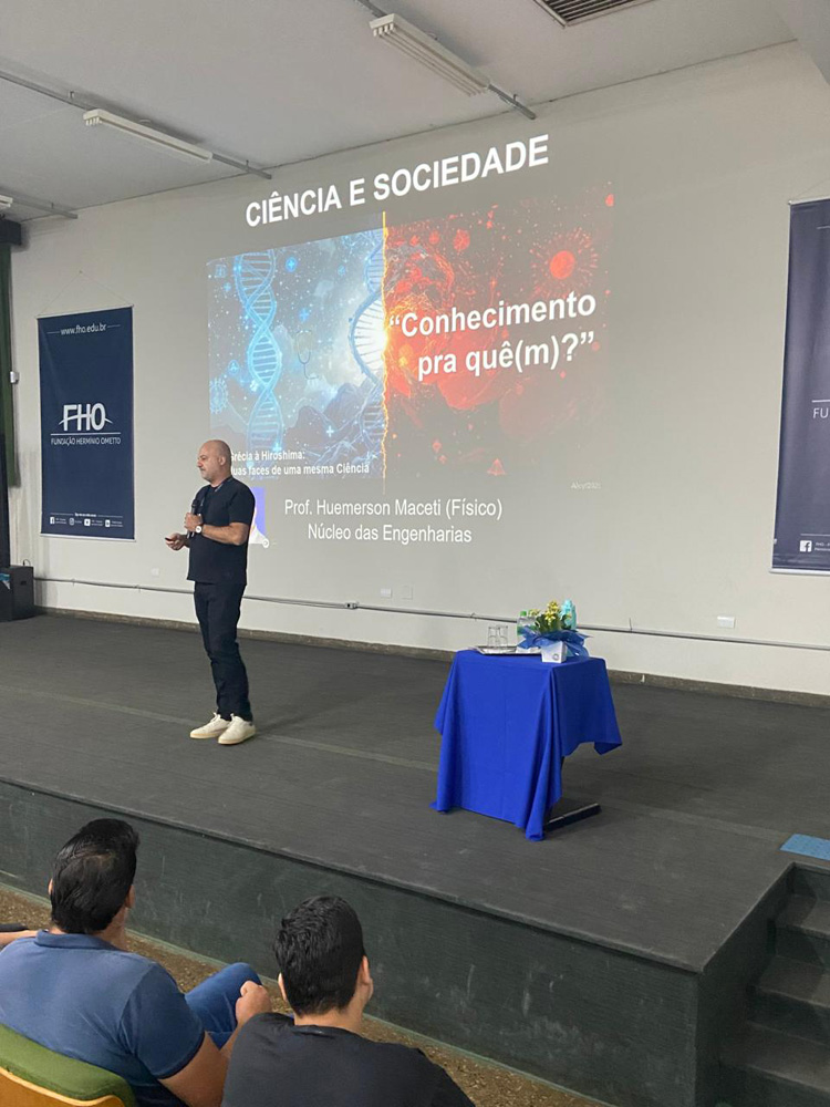 Partindo de uma linha do tempo da evolução científica, o Prof. Maceti levou os alunos a refletirem sobre a ''raridade da vida'' e o peso dos sonhos que os trouxeram até aqui. O tema central questionou o uso ético das descobertas humanas: ''Trabalhamos o olhar apurado que se espera de alguém no Ensino Superior. Para que estudamos e para quem produzimos ciência? A tecnologia é uma ferramenta; cabe ao humano decidir seu uso'', explicou o professor.