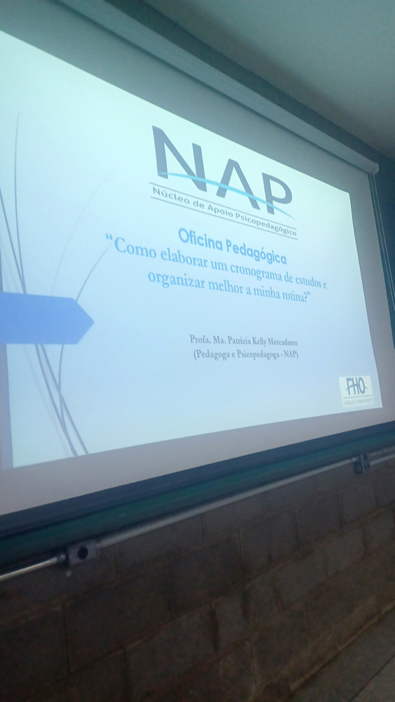 No dia 24 de março, o Núcleo de Apoio Psicopedagógico (NAP) da FHO realizou, nos períodos da manhã e da noite, a oficina pedagógica ''Como elaborar um cronograma de estudos e organizar melhor a minha rotina?''. O evento, sediado no Campus Araras, foi planejado para oferecer ferramentas práticas aos alunos que buscam equilibrar as exigências acadêmicas com a vida pessoal e profissional.